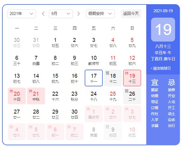2021年9月19日-9月21日放假三天,22日正常上班。祝大家中秋节快乐!